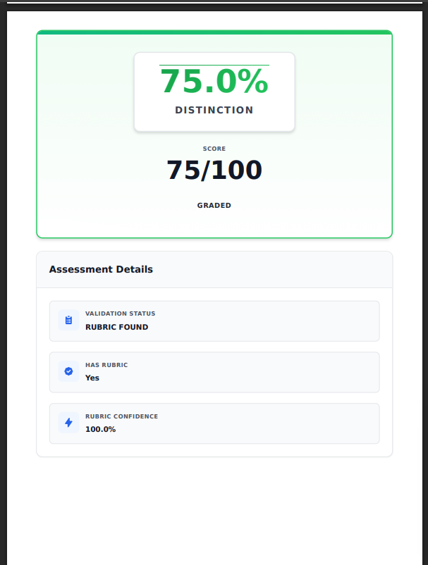 All assignments scored within ±10% of professor marks, demonstrating reliable assessment accuracy.