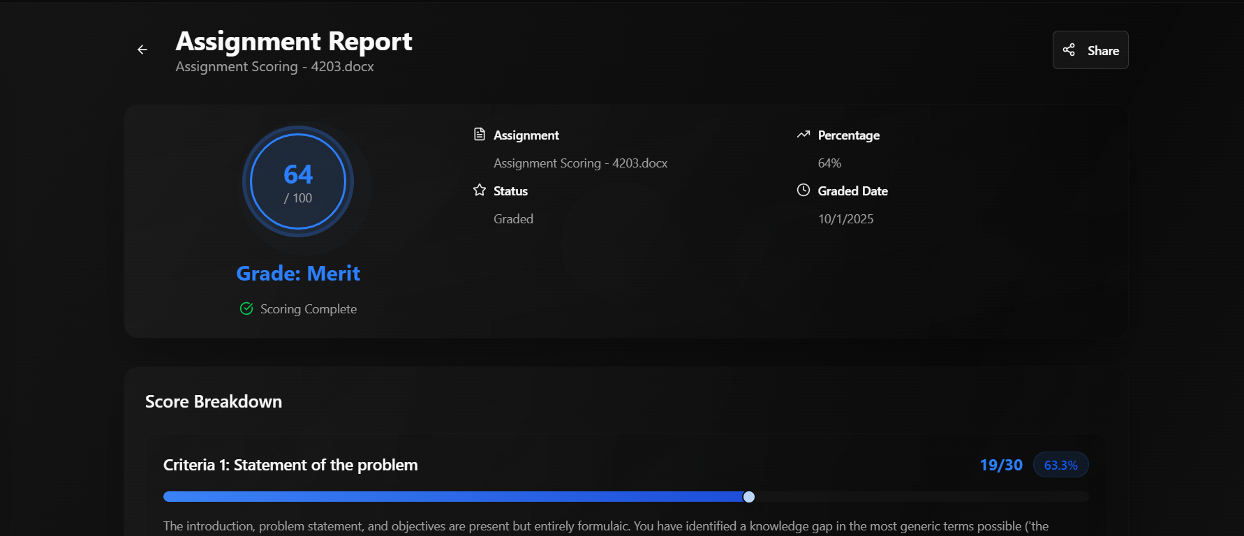 Your assignment is analyzed against the provided rubric and university guidelines with 90% accuracy. Get comprehensive grading with marks per section, identifying strengths and areas for improvement.