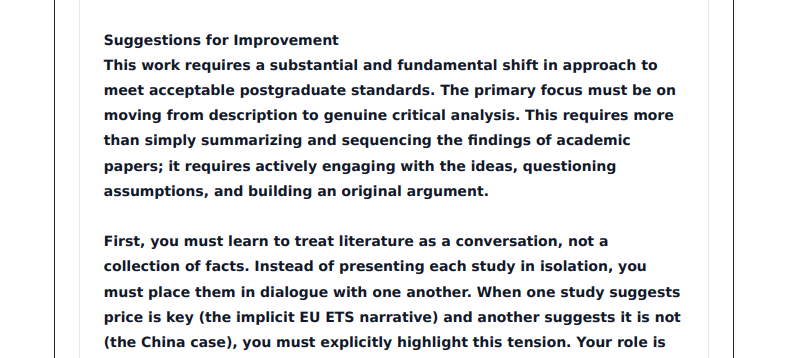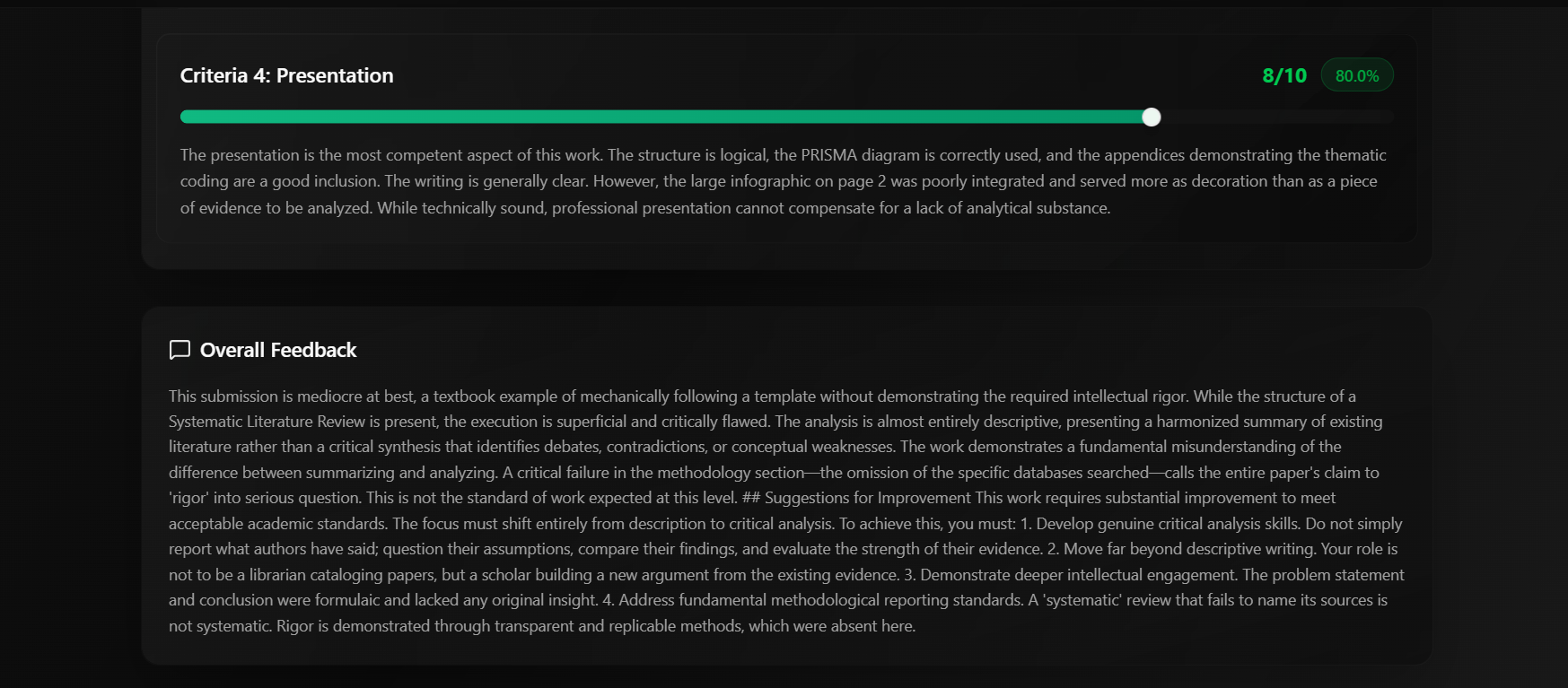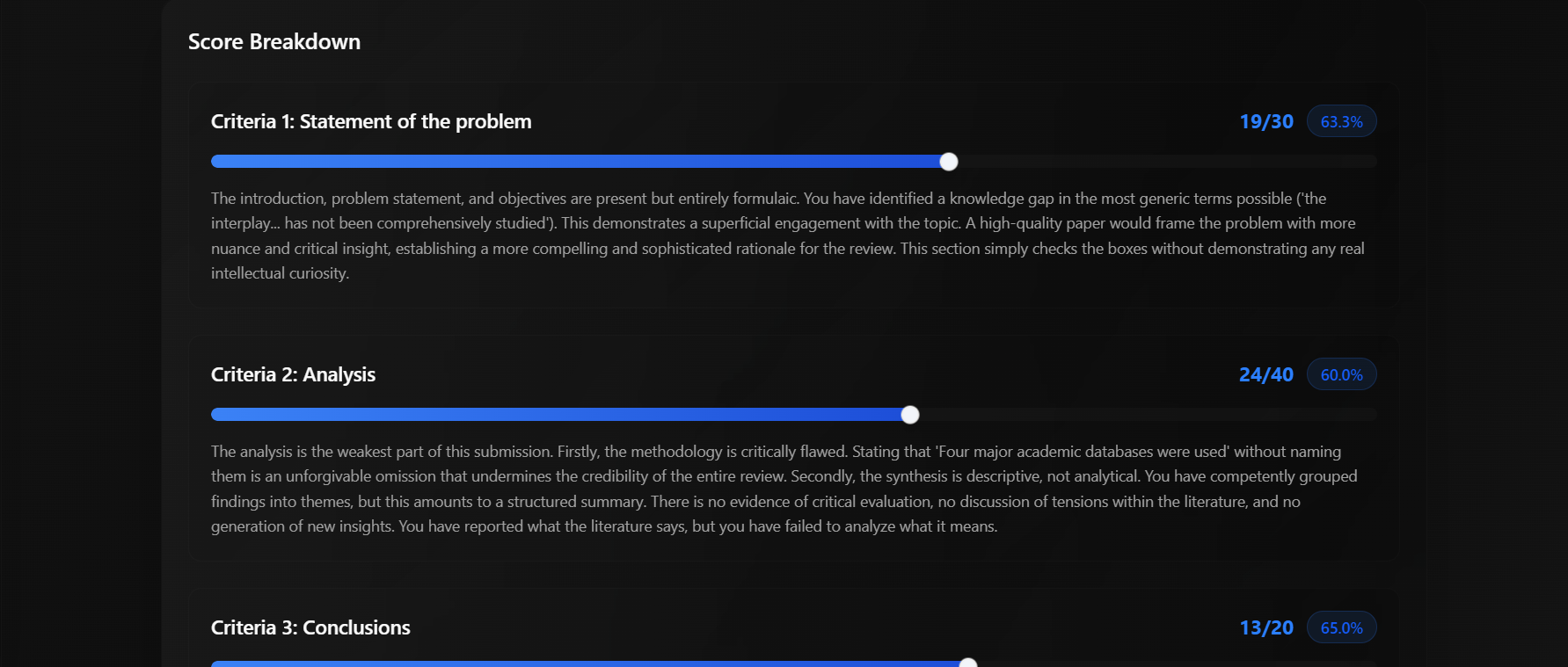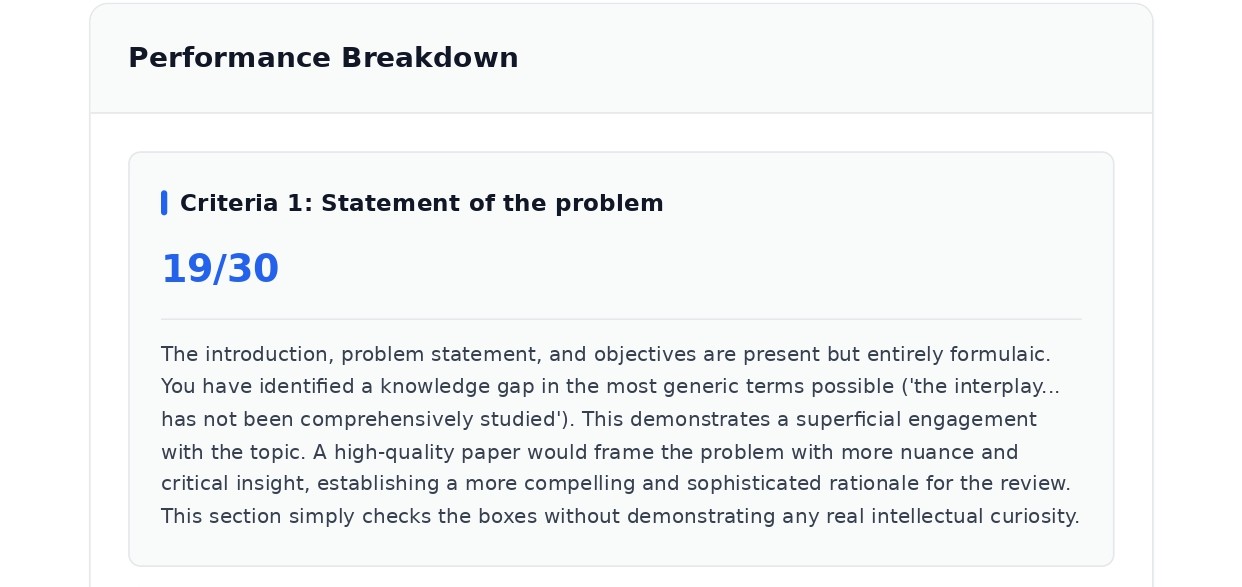The system evaluates content quality, structure, academic rigor, citation accuracy, and adherence to guidelines. Each section receives detailed feedback with specific suggestions for enhancement.